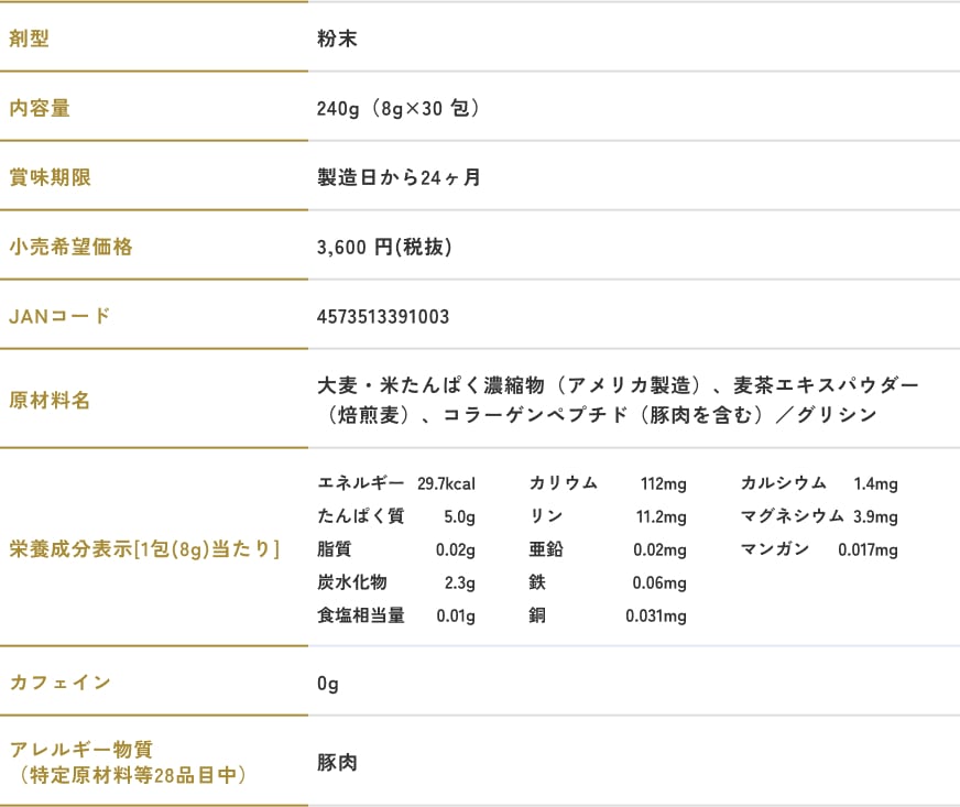 日頃水分補給として摂ることも多い麦茶ですが、それをそのまま置き換えても違和感を抱くどころか、おいしくたんぱく質を摂取できる。一石二鳥の麦茶です。