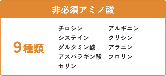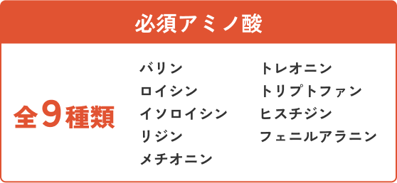 これら20種類のアミノ酸のうち、11種類のアミノ酸(非必須アミノ酸)は体内で合成できますが、9種類のアミノ酸(必須アミノ酸)は体内で合成できないため、食事から摂取する必要があります。